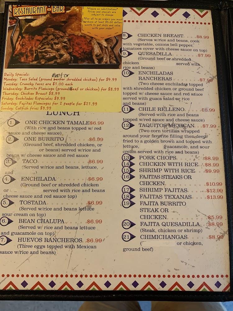 Welcome to El Flamingo Mexican Restaurant, your go-to destination for authentic Mexican cuisine in DeRidder, LA! Located conveniently on US-190, we pride ourselves on serving a vibrant menu featuring local specialties and a wide selection of beers. Whether you're looking to enjoy a quick lunch, a leisurely dinner, or a solo outing, our relaxed atmosphere is perfect for any occasion. With amenities like outdoor seating, takeout, and wheelchair accessibility, everyone can experience the flavors of Mexico. Join us today for delicious fajitas and more, and indulge in a delightful dining experience!